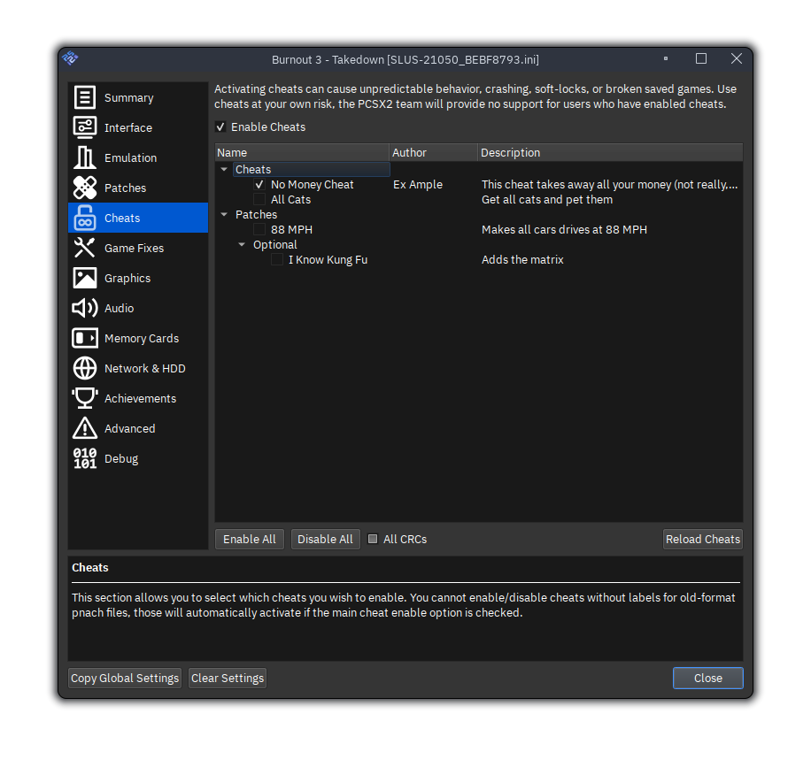 Pnach 2.0 is an incremental update to the patching system which introduces INI-like labels to pnach files. The addition of these labels allows for significant quality-of-life improvements. Each individual cheat or patch can now be labelled, and each labelled cheat or patch will appear as its own item in the PCSX2 UI! This lets you then enable or disable individual cheats or patches from your per-game settings without ever having to touch the pnach files.