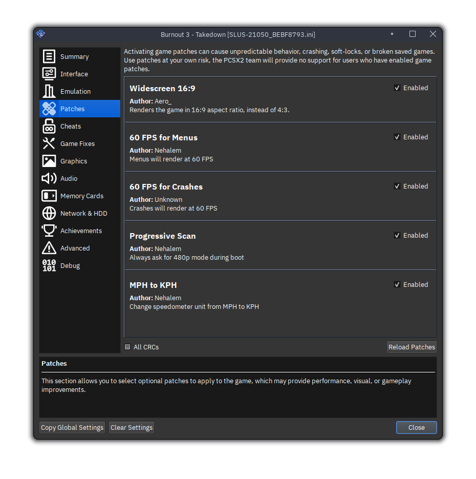 The PCSX2 team now has a separate repository set up for collecting and tracking version history of patches. Any patches present in this repository will be shipped with the emulator. As of now, we generally accept widescreen, no-interlacing, and 60 FPS patches. We have also included a small selection of well-tested, hand-picked quality-of-life improvements for especially troublesome games.